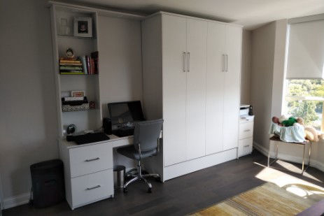 If you would like a work or study station that doesn't take up too much space, the Murphy Bed with Self-Levelling Desk add-on effortlessly transforms your workspace into a full-size bed without the need to clear away the stuff on your desk.