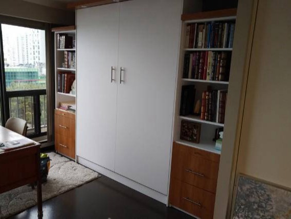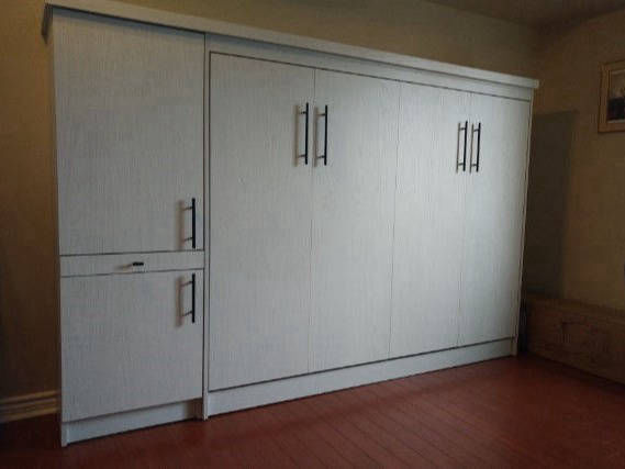 Continental White Raised Panel Style Double size side tilt Murphy Bed with modified SC13 side cabinet and upper cabinet moduleToronto Showroom: