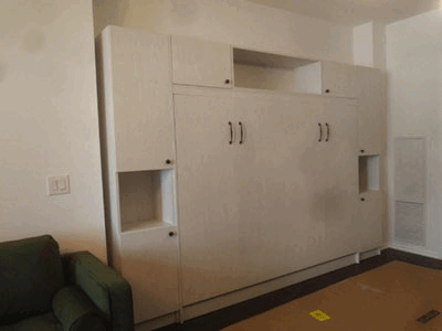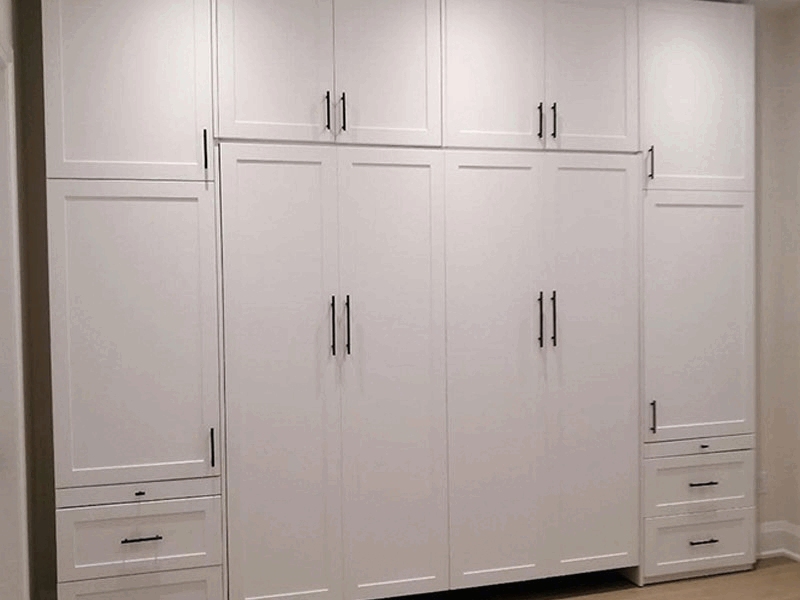 Continental White Raised Panel style Double size Murphy Bed with modified SC11 side cabinets and extended upper cabinet module